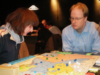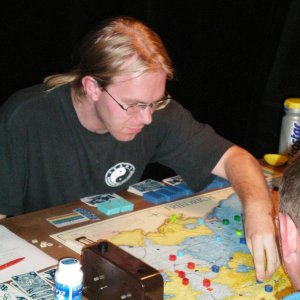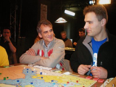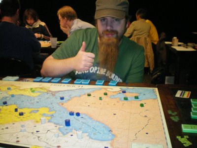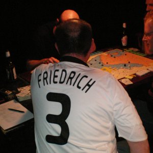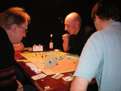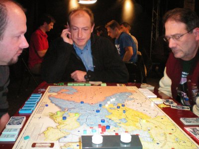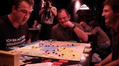 Spiel 24, die letzte Partie der Vorrunde: Bernd Preiß siegt nach 22 Runden mit Preußen. Stefan Altmann und Dennis Kelsey haben wenig zu Lachen...