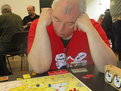 Spiel 7: Guy Atkinson erlebt einen Lord Bute in Runde 6. Und ein großer Angreifer scheidet erst in Runde 14 aus (Frankreich, Klaus Blum). Nach Gedichten in Runde 16 muß Guy noch bis Runde 22 durchhalten bis die Zarin stirbt (Bjorn von Knorring). Ein hart erarbeiteter Preußensieg! Spiel 8: Steffen Schröder kann mit Preußen den Siegeszug der Reichsarmee (Anton Telle) nicht aufhalten: Hildi siegt in Runde 12! Jon Brede Smith und Mark Luta kommen mit Rußland und Frankreich auf 8 bzw. 9 Punkte. Spiel 9: Anton Telle hatte 2 Simultan-Partien gespielt. Und auch in der zweiten siegt er mit der Reichsarmee! Diesmal aber schon in Runde 11. Tobias Kriener (Preußen) kann zudem Magdeburg nicht halten, und so siegt Bernd Preiß zeitgleich mit Frankreich! Loughlin Deegans Zarin stirbt in Runde 10; er macht 8 Punkte mit Rußland. Spiel 10: Richard Sivéls Preußen bekommt Subsidienkürzungen in Runde 9 und 10. Gegen Frankreich (Maurice de Wijs) steht er stabil; die Russen (Jürgen Winter) machen Druck; Schlesien ist absolut sicher. Aber er hat kein Rezept gegen die Reichsarmee (Peter Hannappel)! Diese siegt in Runde 16 — und damit ist der dritte "große" Reichsarmee-Sieg des Vormittags perfekt. |