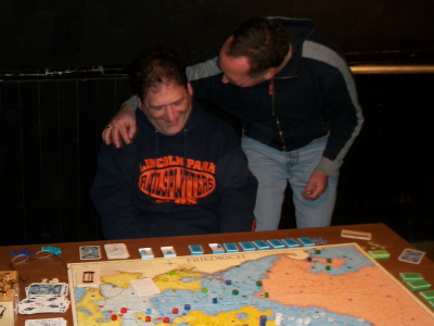 Wenig später ist Stephans Frankreich ausgeschieden. Dennis lacht — und dennoch ist Preußens Situation hoffnungslos. Manfred Wichmann tröstet. (Spiel 8).