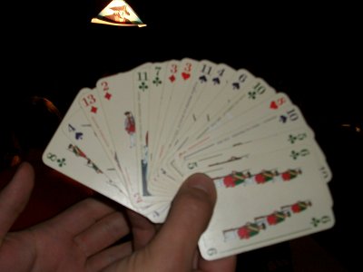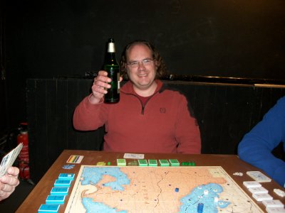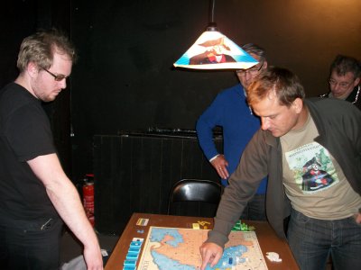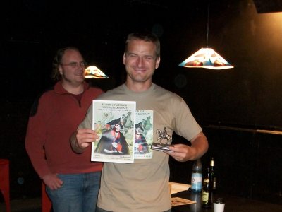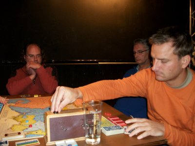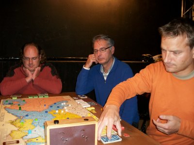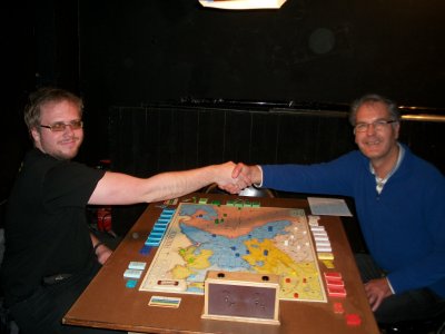 Die Partie begann im Westen mit großem Tempo: Schon in Runde 2 legte Hannover einen −4 Rückzug hin. Anton setzte methodisch weitere Daumenschrauben an, und so gingen beide Hannoveraner in Runde 5 in Lauenburg vom Brett. Damit lagen die hannoverschen Zielstädte ungeschützt da! In der Zwischenzeit hatte Daniel Hildi weit gen Südwesten gescheucht. Österreich hatte seine Zielstädte in Sachsen erobert und wandte sich nach Schlesien, wo Daniel einen 3er-Turm mit 20 Armeen gebaut hatte. Die ersten Kämpfe begann Österreich mit −16 und −9. In Runde 5 hatte Klaus gar die Möglichkeit, den preußischen Turm einzukesseln. Er traute seinen Pikvorräten jedoch nicht den Sieg zu. (Eine nachträgliche Analyse zeigte: zu Recht.) — In diesem Augenblick lag eine ungheure Anspannung über dem Tisch! Peter hatte in den ersten Runden seine Fühler nach Ostpreußen ausgestreckt. Aber Daniel war nicht gewillt, dort den Hasen-Lehwaldt zu machen (d.h. Lehwaldt geht beim ersten Feindkontakt vom Brett ohne eine TK zu spielen). Mangels Herz kam Peter nicht voran. Nach dem Hannover-Debakel mußte Preußen dringend Feuerwehr im Westen spielen. Seydlitz attackierte mit 1 Armee einen französischen Turm mit anfänglich −11, und zwar in Karo, das auch gg. Österreich gespielt wurde. Anton konnte sich aber mit einer Reserve sofort aus dem Kampf lösen. (Ab nun verteidigte Daniel gg. Österreich v.a. in Kreuz.) Bislang sah es nicht nach einem sehr sattelfesten Preußen aus. Aber dann kam der erste Paukenschlag: Ein −11 Rückzug der Österreicher in Runde 6! Und das Schicksal folgte stehenden Fußes: Runde 6 brachte Elisabeth! Eine Runde später folgte Indien!! Und am Ende der Runde 9 schied Schweden aus!!! Zu diesen Schicksalsschlägen kam, daß sich Klaus eine Passion daraus machte mit großer Armeen-Unterzahl in die Kämpfe zu gehen: −12 in Runde 7, −14 und −15 in Runde 9, −13 in Runde 10, −14 in Runde 11. Als Österreich dann die Kreuz ausgingen (Runde 12) ging von den Weißen nur noch wenig Aktivität aus. Es verblieben Antons Franzosen und Peters Reichsarmee. Die Franzosen machten weiter methodisch und gekonnt Druck, bei totaler Strapazierung des TK-Stapels. Mehrere Runden hatte Anton nur 5 TK auf der Hand. Auch Hildi machte Druck, jedoch ohne reelle Siegchance. Hierzu hätten die Österreicher ihren Observierungsposten in der Lausitz aufgeben und gen Westen abmarschieren müssen. In Runde 15 ritt Soubise eine finale Attacke auf Magdeburg. Mit der allerletzten TK schaffte es Anton, die preußischen Herz leerzuspielen, aber er unterlag dennoch mit −3. (Die Hannoveraner waren seit Runde 6 immer wieder auferstanden aber immer schnell vom Brett geschickt worden.) Nach diesem großen Herz-Showdown war die letzte Siegchance der Angreifer dahin. Lord Bute in Runde 16 konnte den preußischen Sieg nicht mehr gefährden. In Runde 17 verlor Frankreich Amerika und der neue Weltmeister stand fest: Daniel Dunbring aus Schweden! |