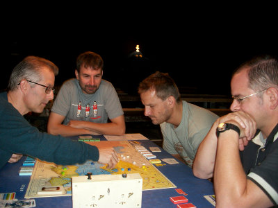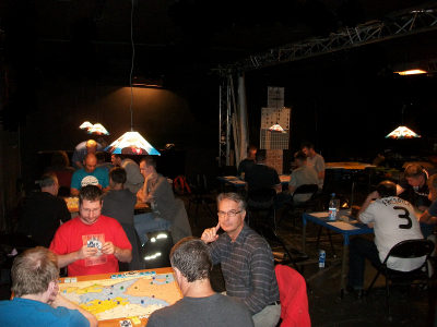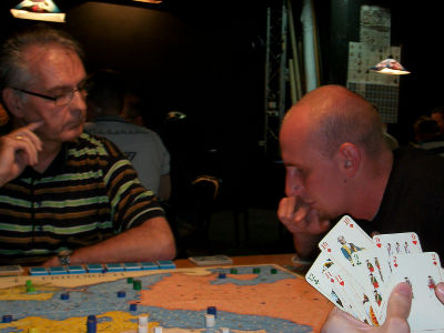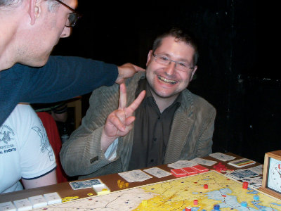 Partie 6: Daniel Dunbring, der Titelverteidiger, leidet unter Lord Bute (Runde 8). Steffen Schröders Österreicher und Maurice de Wijs' Russen setzen ihm hart zu. Schließlich siegen beide zeitgleich in Runde 10. Partie 7: Anton Telle fährt einen zu keiner Zeit gefährdeten Preußensieg ein. Das Schicksal war ihm hold: Frankreich scheidet in Runde 8 aus, die Zarin folgt in Runde 10. So kommt es, daß sich Christian Blattners Österreich wie bei einer Offensiv-Option von blauen Steinen überflutet sieht. Partie 8: Am Nebentisch hoffen Peter Hannappels Schweden auf einen Tod der Zarin in Runde 6 (sie haben alle Zielstädte 1. Ordnung). Jedoch, es erwischt sie selbst in ebendieser Runde. Die Zarin verstirbt eine Runde später! Bitter! Äußerst bitter! – Schließlich siegt Marian Leimbachs Preußen in Runde 18. Partie 9: Bernd Preiß hat als Preuße zu kämpfen und zu fluchen, vor allem Alex Hofmanns Russen setzen ihm hart zu. Und Mark Lutas Österreicher stehen in Runde 14 schwer auf Sieg. Aber, Preußen hält (Sieg in Runde 16). Partie 10: Manfred Wichmann steht nach frühem Tod der Zarin zunächst äußerst sicher. Er sammelt eine unglaubliche Herzfahne. Plözlich aber vergißt er, daß man auf Hauptstraßen 4 weit ziehen darf. Seydlitz und Friedrich geben die Deckung Magdeburgs auf, Soubise reibt sich die Hände. Nur unter massivem Pikeinsatz kann Manfred den Schnitzer auspolieren, bevor Diepholz fällt. Eine knappe Kiste! |