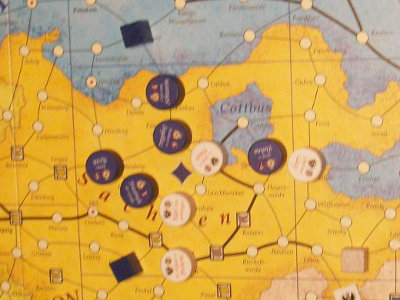 Partie 3: Klaus Blum beäugt Steffen Schröders Zug mit Rußland. Im Vordergrund die TKs von Österreich (Andrew Brown). Partie 4: Alex Hofmann jubiliert! Soeben ist Händel gestorben. Also darf auf Halle nicht gekämpft werden. Da trifft es sich gut, daß Soubise gerade auf Halle steht. |