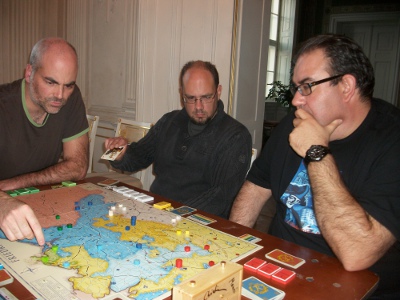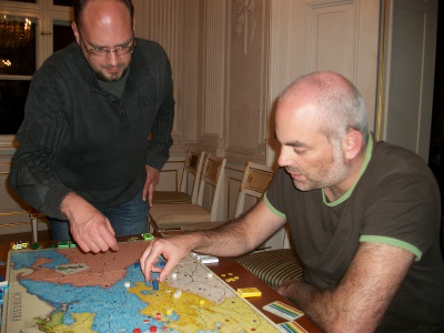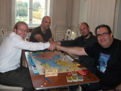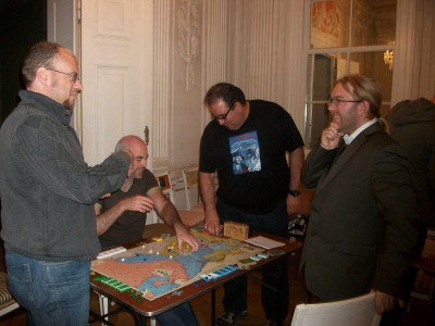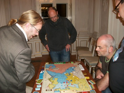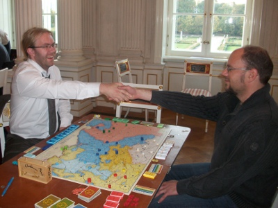 Bjorn versammelt zielstrebig drei Generäle in Sachsen und baut einen Turm mit 23 Armeen (genau richtig um gegen einen 24-Armeen-Turm Österreichs ein automatisches −1 zu nehmen). Ferdinand wird auf die Schweden losgelassen, während Seydlitz die Franzosen an der Pik-Herz-Grenze vor Magdeburg erwartet. Durch die schwache Deckung Hannovers sammelt Alberto schnell Zielstädte ein, während Österreich Schlesien links liegen läßt und für einen Großangriff auf Sachsen mobilisiert. Alex Russen schickt Lehwaldt schnell vom Brett, aber ignoriert zunächst den Verteidiger Kammins. Stattdessen ziehen Saltikow und Fermor Richtung Berlin. In Runde 6 bietet Bjorn in Sachsen eine Einkesselung an. Peter nimmt dieses Angebot an, und es kommt zu einer heißen Karoschlacht: Österreich unterliegt knapp mit −3 verlor. Währenddessen schlagen die Russen einen Troß südlich von Berlin und ziehen dann Richtung Stettin, und Frankreich erobert alle Zielstädte außer Magdeburg und Halberstadt. In Runde 7 greift Alberto mit allen 3 Generälen den einsamen preußischen Wächter Magdeburgs an. Französisches Pik gegen preußisches Herz. Preußen gelingt es hierbei, Frankreich alle Pik zu ziehen. Direkt danach schließt Schweden Frieden. Ferdinand ist nun wieder frei und zieht zurück nach Hannover. Peter erkennt Frankreichs problematische Situation (kein Pik!) und schickt Cumberland bei Haldensleben vom Brett, um zu verhindern, daß Seydlitz für Sachsen verfügbar wird. In Runde 9 entschließt sich Bjorn den französichen Turm mit Seydlitz erneut anzugreifen. Diesmal ist es Pik gegen Pik. Alberto hat jedoch eine Reserve und kann sich um −1 zurückziehen. Der preußische General ist unversorgt und wird umgedreht. Anschließend blockiert Frankreich alle Wege zurück ins preußische Heimatland und Seydlitz geht vom Brett (Runde 10). Direkt davor stirbt die Zarin und Alex übernimmt die Reichsarmee. Die Verteidigung Magdeburgs und Halberstadts liegt nun ganz in den Händen von Schwerin. Alex erkennt das Prekäre der Situation nicht und greift ebendiesen an. Schwerin geht vom Brett und somit ist das Erobern der letzten Zielstädte für Frankreich kein Problem. Alberto siegt in Runde 10 und ist der neue Friedrich-Weltmeister! |